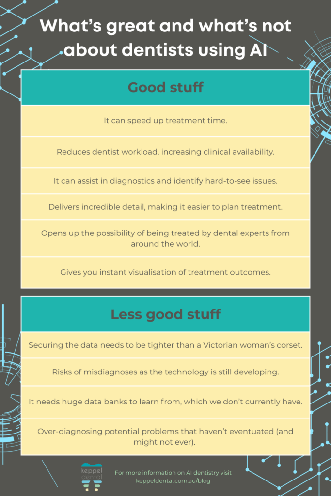 Many industries that have already adopted AI understand that it’s just a tool. It’s there to assist the professional with their work, not replace them. By cutting down the amount of time dentists spend on necessary day-to-day tasks—analysing x-rays, responding to simple health-related queries, predicting treatment outcomes—we can increase our clinical time (more face-to-face time with patients) and complete treatments in shorter timeframes.