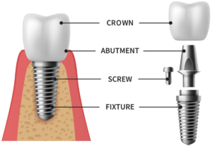 Technically speaking, the implant is the titanium screw-like part. It’s the bit that’s implanted into the jaw. But to make things easier the entire thing—implant, abutment and ceramic crown—is referred to as ‘a dental implant’.