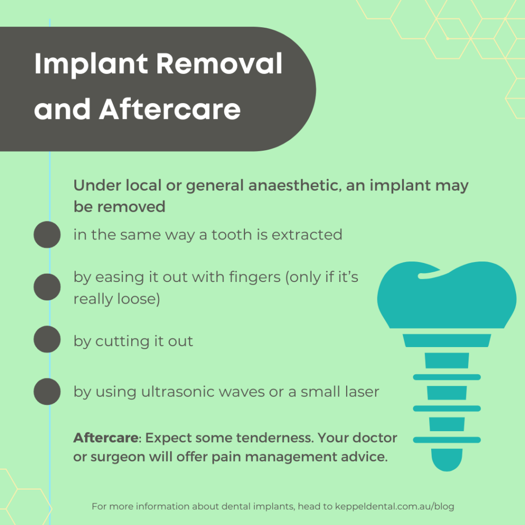 - The dental implant survival rate is very high in Australia. But dental implant removal may occur for one of the following reasons.